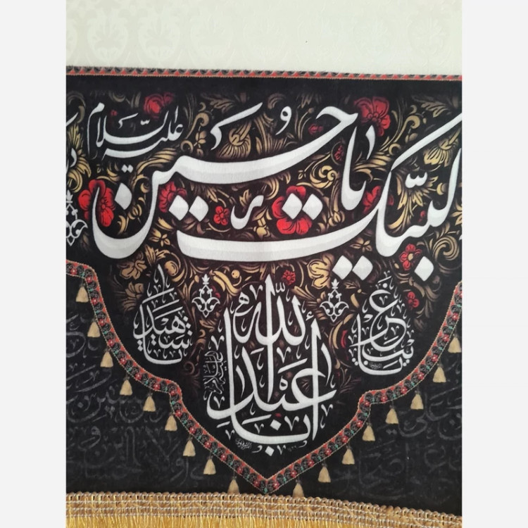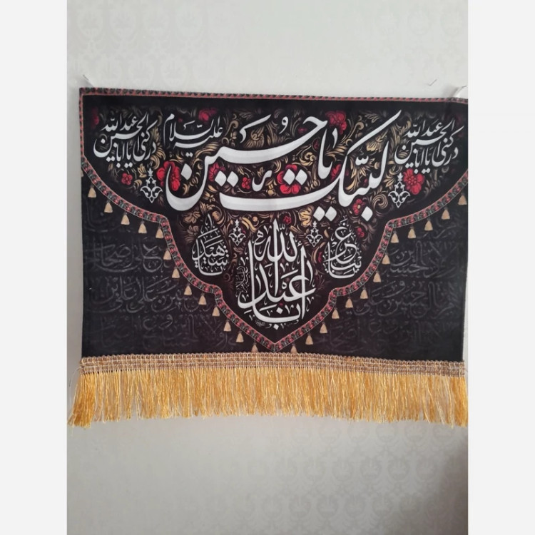 بیرق .پرچم .کتیبه ((لبیک یاحسین)) جنس :مخمل ،پارچه ای قابلیت شست وشو :دارد. طول :44سانت عرض:33 سانت دارای ریشه باکیفیت دارای دوعدد بند برای نصب