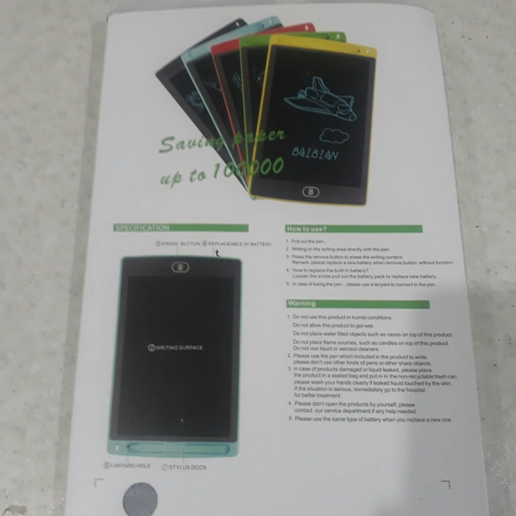 ✔صفحه نمایش :8.5 اینچی ✔وزن:سبک وقابل حمل ✔دکمه مخصوص پاک کردن ✔در چندین رنگ مختلف ✔دارای دوعدد باتری گرد ✔دارای قلم ✔برای پاک کردن صفحه ابتدا باید قفل پشت صفحه باز شود تا بتوان به راحتی صفحه روپاک کرد. ✔مناسب کودکان بالای 3 سال ✔طرح جلد تبلت دونوع می باشد 🔴ازهمه مهم تر استفاده از کاغذ کمتر 🔴 👈👈👈برای ماندگاری بالاتر جلوی نور خورشید قرار ندهید.